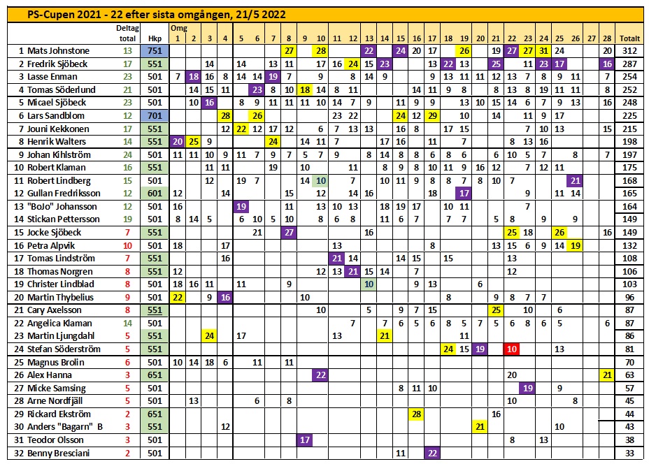 Röd bakgrund anger att spelaren lämnat utan att fullfölja skrivning/meddelat tävlingsledningen, räknas ej som giltig start avseende kvalificering för finalspelet.